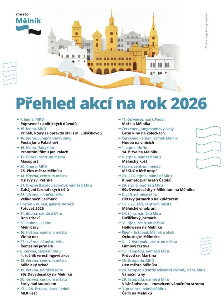 Rok 2026 přinese do města Mělník pestrou nabídku desítek akcí – od setkání a koncertů přes slavnosti až po aktivity určené dětem, rodinám, seniorům i mladým lidem. Přinášíme vám přehled nejzajímavějších událostí, na které se můžete v průběhu roku těšit.