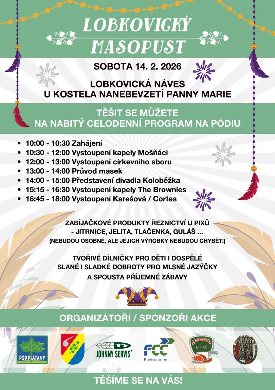 Na Lobkovické návsi v Neratovicích se v sobotu 14. února 2026 od 10:00 opět rozezní hudba, smích a tradiční masopustní veselí. Čeká vás celodenní program plný živých vystoupení, průvodu masek, divadla i poctivých zabijačkových specialit. Lobkovický masopust nabídne zábavu pro malé i velké, prostor k setkávání a přátelskou atmosféru ❤️, na kterou se nezapomíná. Přijďte si užít den plný radosti, chutí a společné zábavy ✨